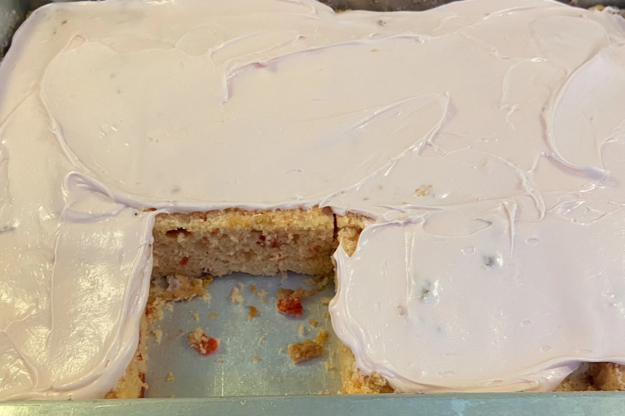 I did have a second piece, just to make sure my new frosting solution was the right one, and then I took the rest over to my favorite sister-in-law’s house. While they did not have my nostalgic appreciation for the cherry chip experience, they did enjoy it. I hope you’ll give it a try.