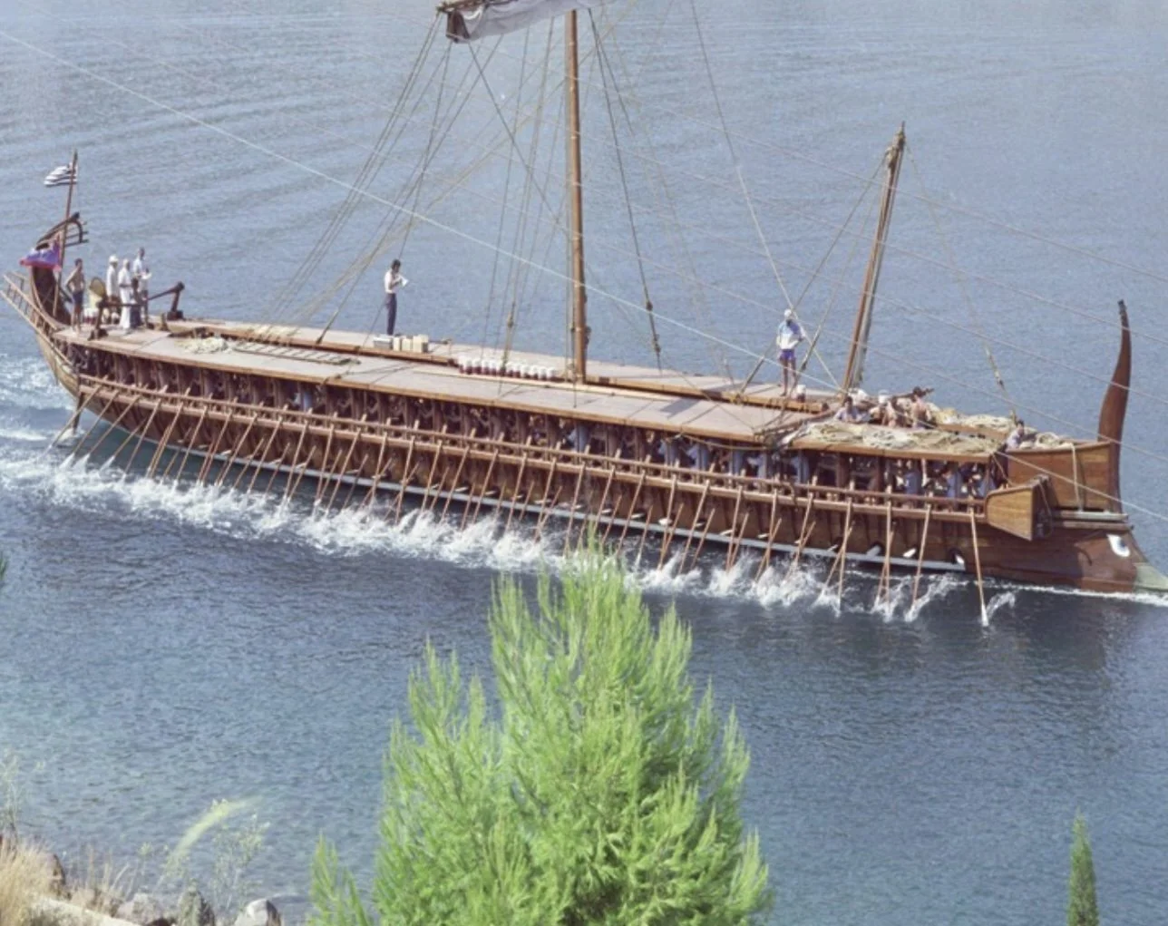 All of this research on ancient ships in general and triremes in particular culminated in a joint project in the 1980s, Ressler explains, when “classical scholars, naval architects, and rowing enthusiasts” came together in Greece to actually build a trireme and take it out on the seas. The Greek trireme is a long narrow ship that carried three levels of rowers and had a bronze ram on its front end for ramming and destroying enemy ships, generally other triremes. The trireme is perhaps most well known for the Battle of Salamis in the 5th century BC, where greatly outnumbered Greek ships utterly destroyed the Persian fleet sailing (rowing) against them. To say that this modern reproduction is an impressive feat of engineering is a serious understatement. To collect every possible clue from various ancient sources and actually build the thing? Absolutely brilliant.