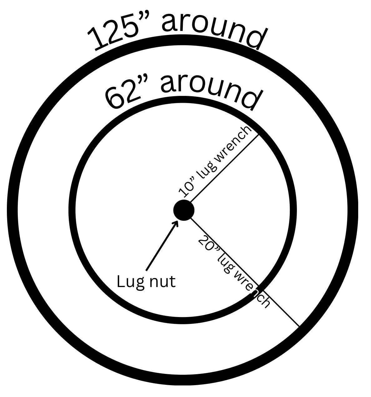 Let me explain. The crappy sub-par tire iron which came with my vehicle has a 10” handle. That means when I’m using it, my hands will be traveling about 62”…the circumference of the circle I’ll be “drawing” when I rotate the tool all the way around while holding the end of it. But when I use my 20” breaker bar, the circumference of that circle is 125”, twice the distance. So I can use less force but I will have to make the breaker bar travel a greater distance. Again, force can be traded for distance. Trust me…when it comes to removing lug nuts, this is an excellent trade.