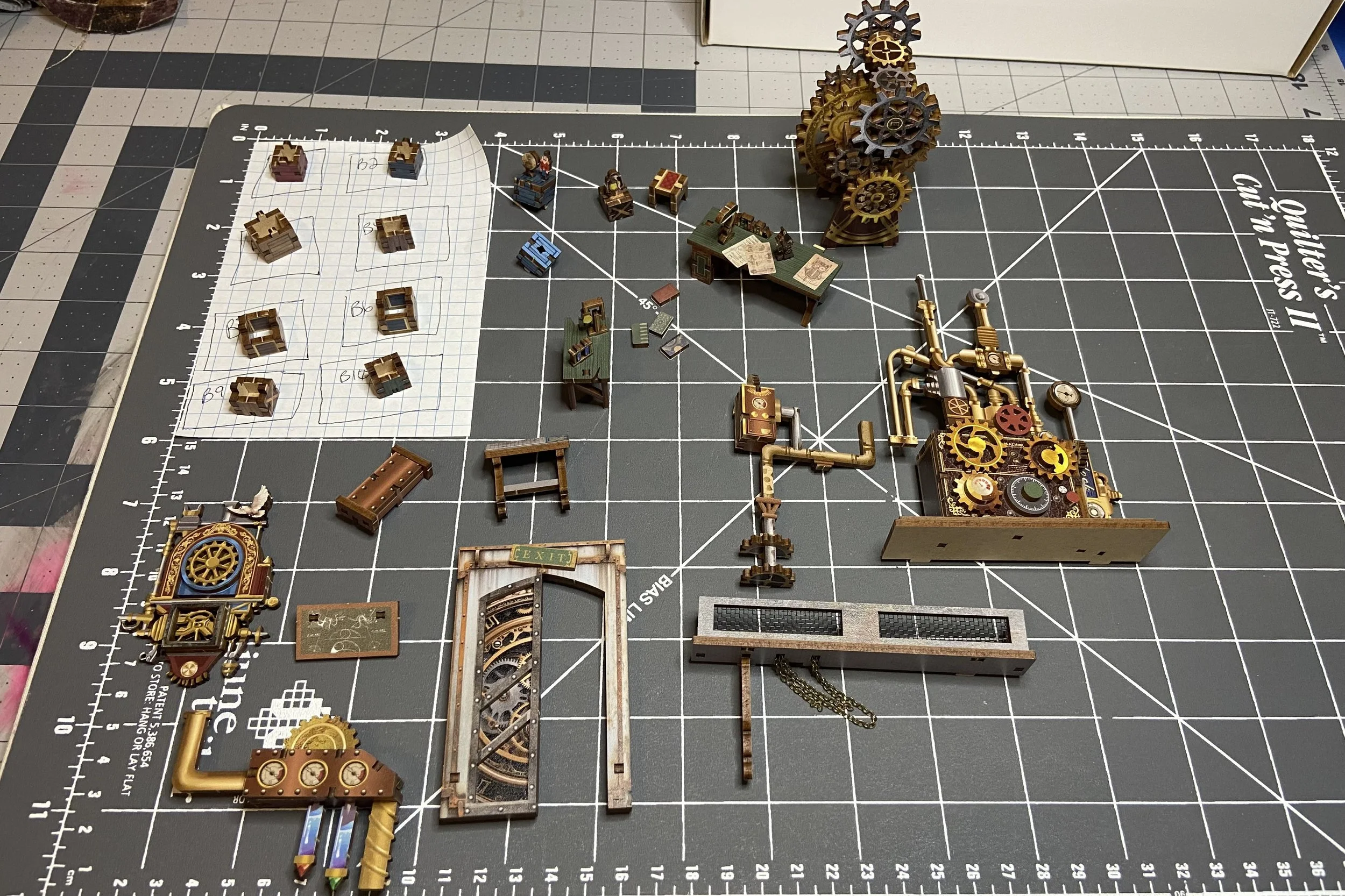 A lot of the miniatures were “gear-heavy” and I had to pay real attention to the sequence of assembly and the orientation of the pieces. Although the kit is beautifully crafted and all the pieces do slot in where they are supposed to, the fit is often quite tight. And if one is pushing very hard on a long skinny piece to get it into its slot, it’s very easy to snap the piece in half. (Ask me how I know. No, wait, don’t ask me…I won’t be able to explain without using bad language.) In the case of the picture below right, you can see that I just gave up trying to push the piece in any further and left it as it was. Even I can’t see the problem portion in the finished booknook.