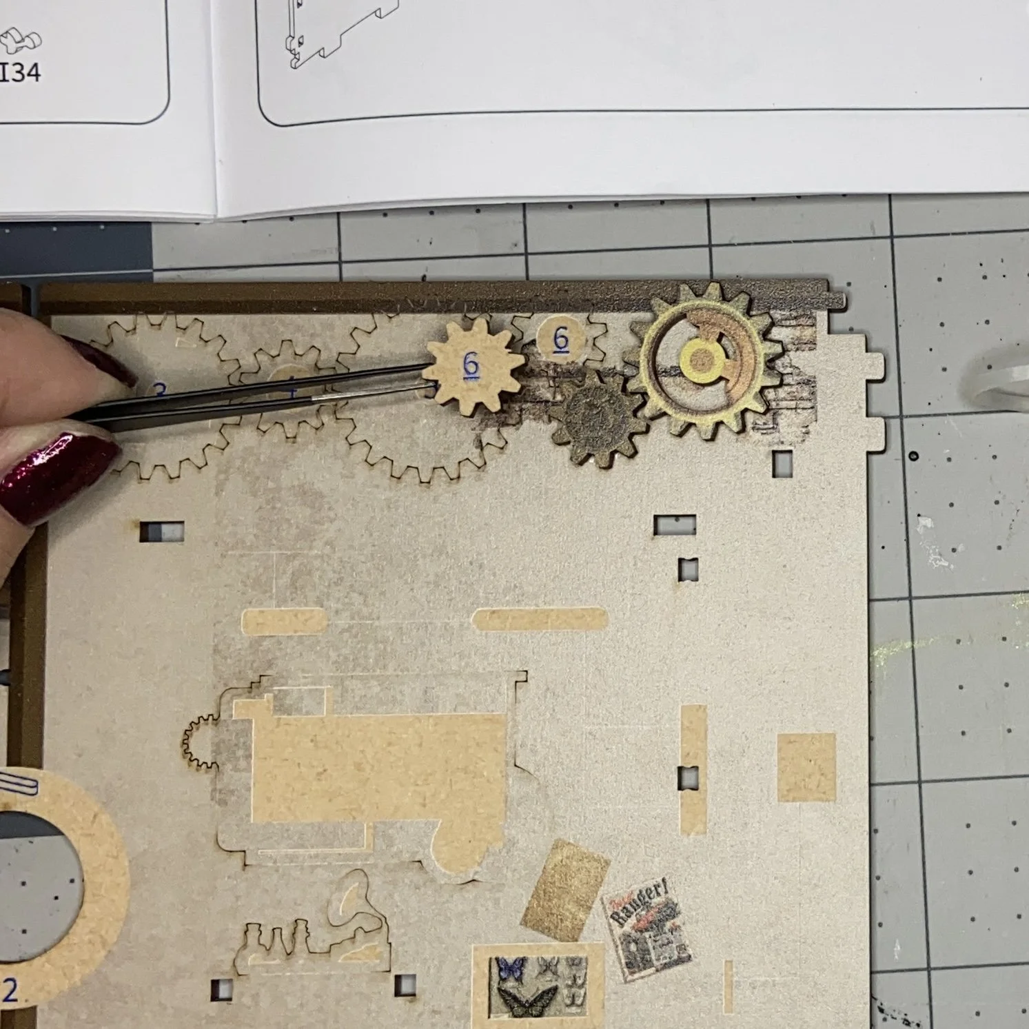 Another big help is the fact that the walls are often sort of engraved with the shapes of the pieces that are to be glued on. And in a few cases, such as when there are a series of gears to be glued in place, there’s even a number on the wall that corresponds to a number on the listed gear. So helpful!