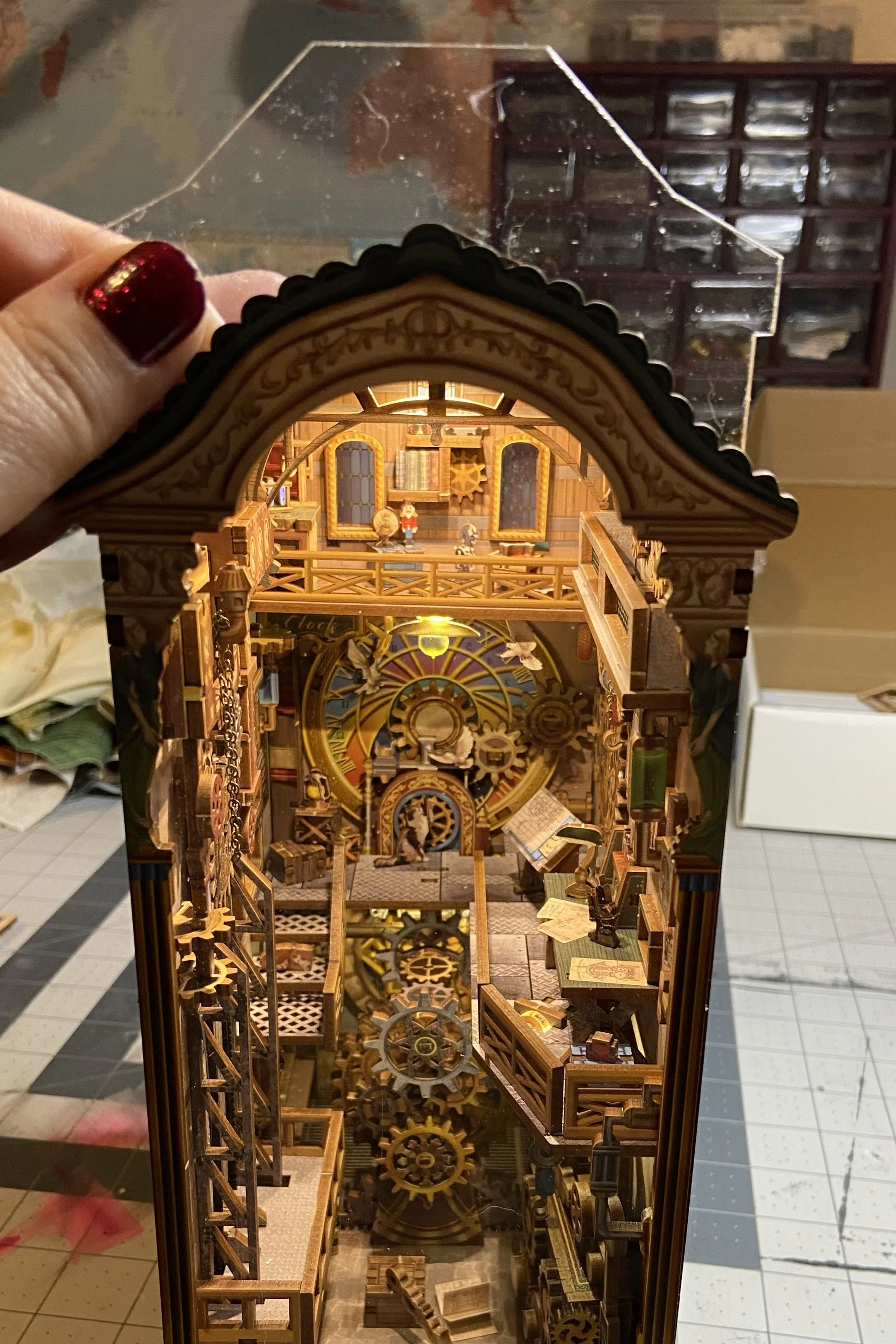 The wiring went in easily, both due to design (thank you, Tonecheer) and excellent directions (I did it!). Since that’s not always the case with booknooks, I really appreciate it when the wiring process is easy. The nook also does have an enclosed (mostly) roof and a clear dust barrier closing off the front, so it should stay relatively dust-free, which is always nice.