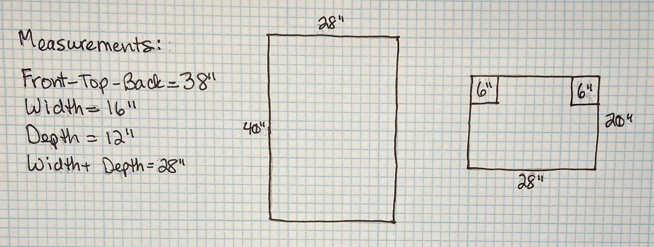First, I measured. I took three measurements…the first started at the bottom front of the machine, went over the top, and all the way down to the bottom in the back. That measurement was 38”, which I decided to round up to 40” for some wiggle room. Then the width of the machine (left edge to right edge) measured at 16”. And finally the depth (from the front edge of the machine to the back edge, as measured along a side) came to 12”. Then I made one additional calculation, which was adding together the width and depth measurements for a total of 28”.