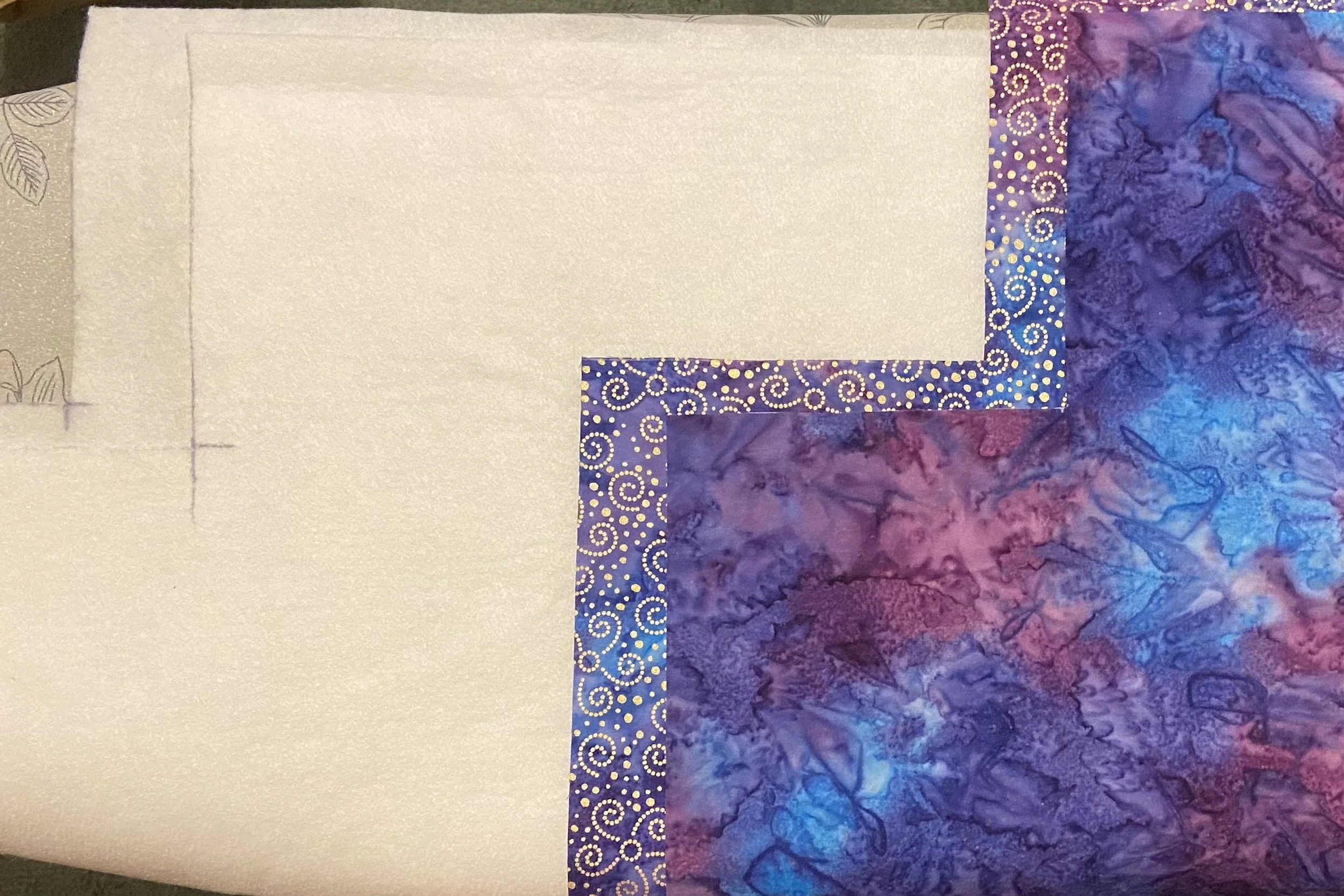 Then I drew myself a little diagram to make sure I could box the corners on this one (unlike the last attempt). After I drew out my 28” by 40” rectangle, I decided to make this in two pieces, so I drew another rectangle that was 28” by 20”. There were two reasons for this…for one thing, it’s easier to come up with scrap pieces that work if you don’t need huge pieces. And also, the whole thing would be much easier to handle during the quilting if it was not full-sized to start with. So out of my Pellon fusible fleece, I cut two pieces that were 28” by 20”, with 6” squares (half of the depth measurement) cut out of the upper corners, as indicated in my diagram. And then I found some lining fabric, and cut it exactly the same way.