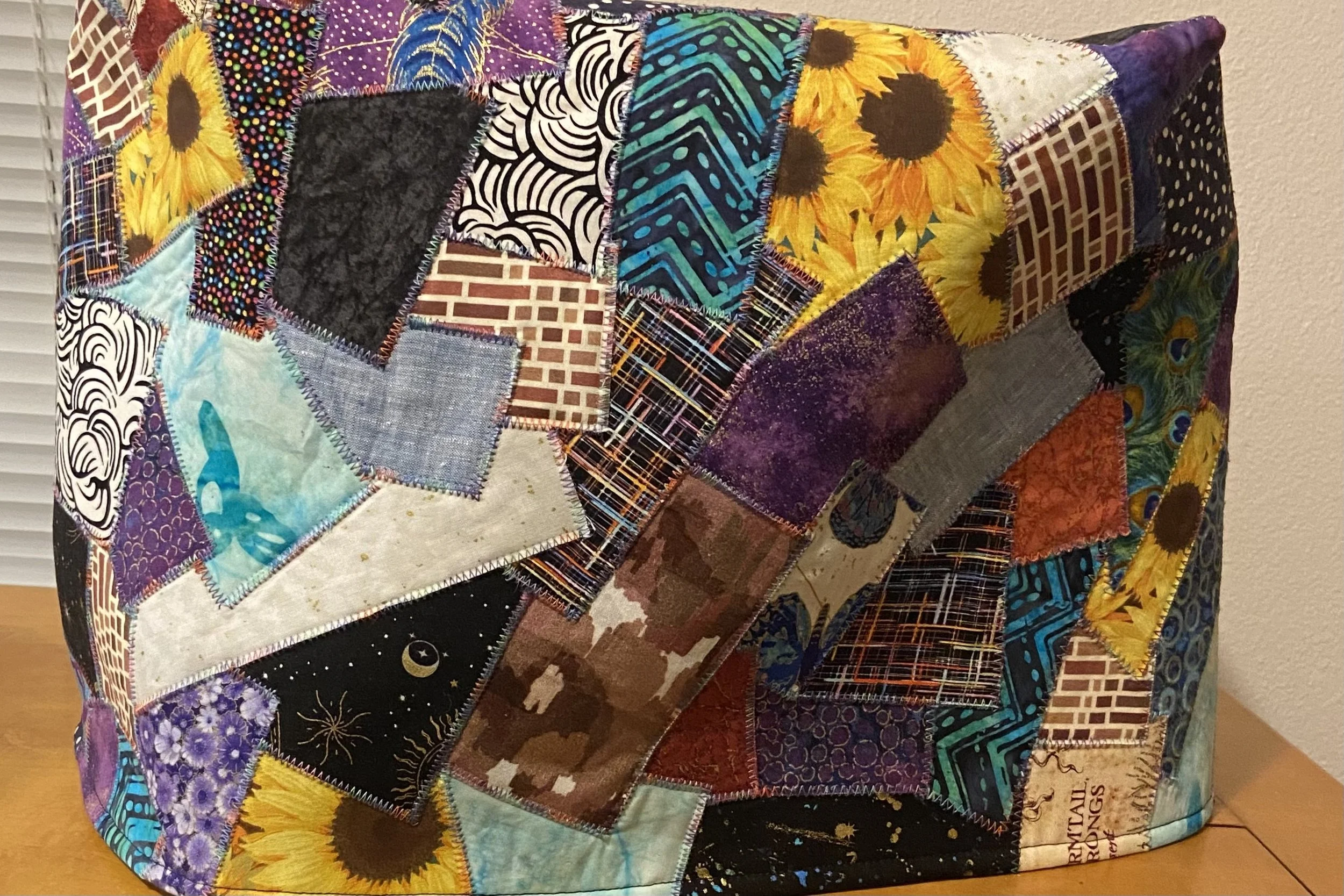 Onward to the quilting. For this project, I opted to do the same kind of crazy quilt work I’d done on the coasters I made before. Working on the glue side of one piece of Pellon at a time, I laid down pieces of scrap fabric, including some already-seamed-together off-cuts from my recent quilt. Once the pieces were laid out, I used my iron to adhere the fabric down (well, the parts of the fabric that actually touched the Pellon). Then I turned the pieces fabric-side down and cut off the fabric that extended past the edges of the Pellon.