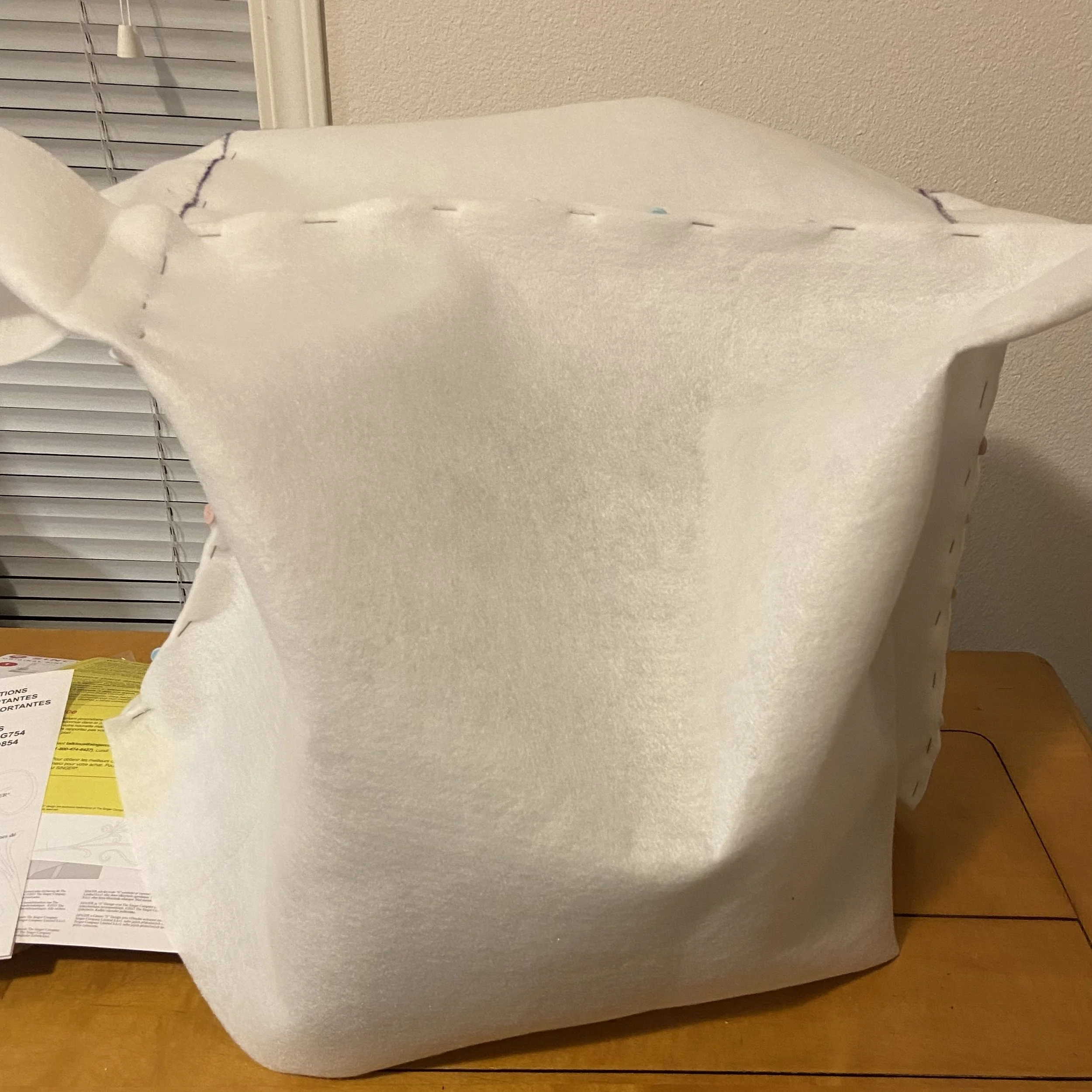 After I’d cut out all four pieces, I took a few minutes to pin together the Pellon pieces along what would be the seam lines to see if it would fit over the top of Hester. No point in continuing on if I wasn’t sure it would fit…as you can see, while it looks a little odd, it did fit quite nicely.
