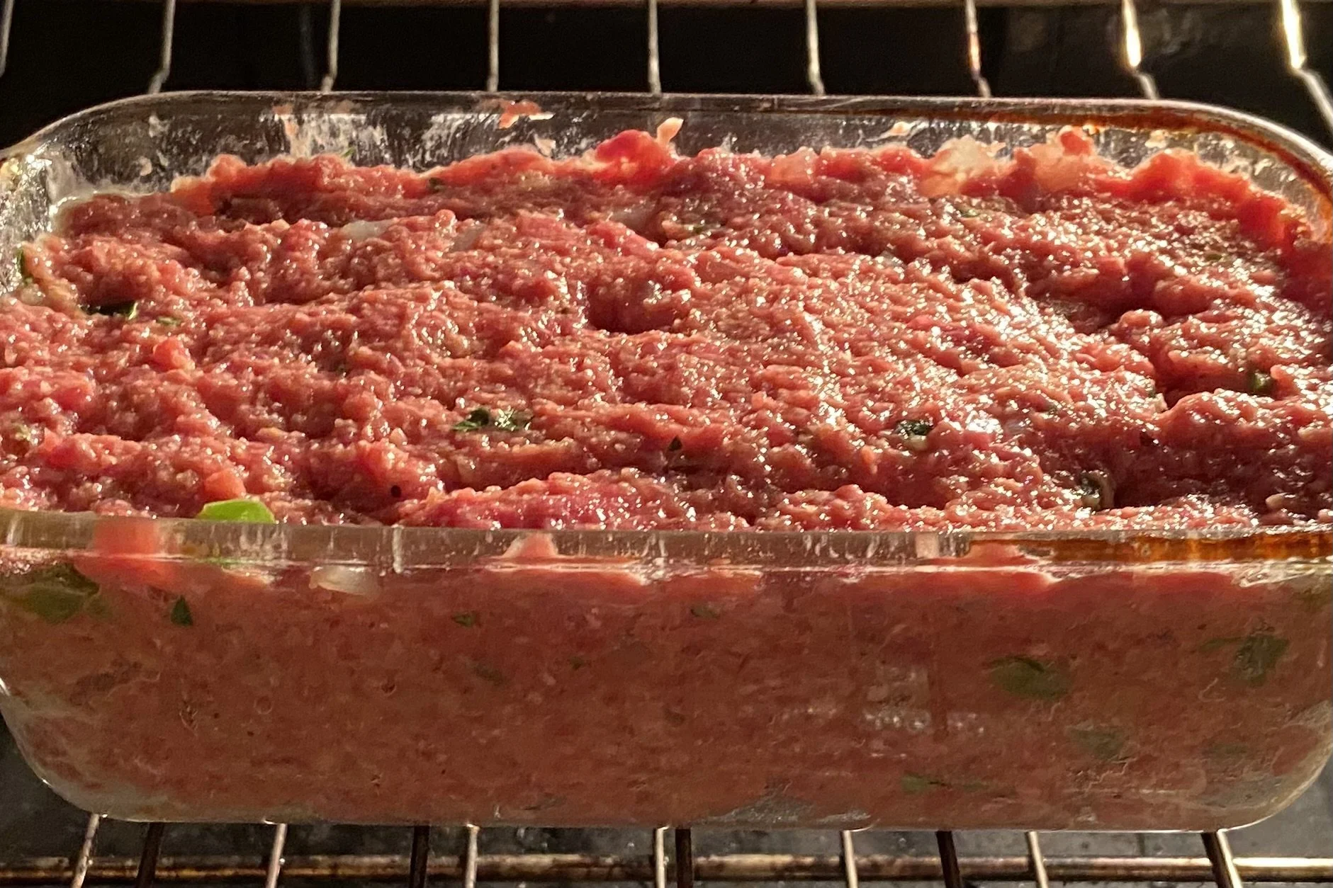 In a big bowl, you whisk together all your wet ingredients and your spices, then whisk in your sauté mixture. Finally, dump in your ground beef (lower fat is better) and with your hand, gently work everything together. Pro tip: if, like me, you don’t like cleaning ground meat out from under your fingernails, just pop on a disposable latex glove to do the hand mixing. Put everything in a greased loaf pan, and press it down firmly. This will help the loaf hold its shape. Bake it for awhile, then top with a ketchup/brown sugar/vinegar glaze and bake it a little longer. The internal temperature needs to be at least 165°.