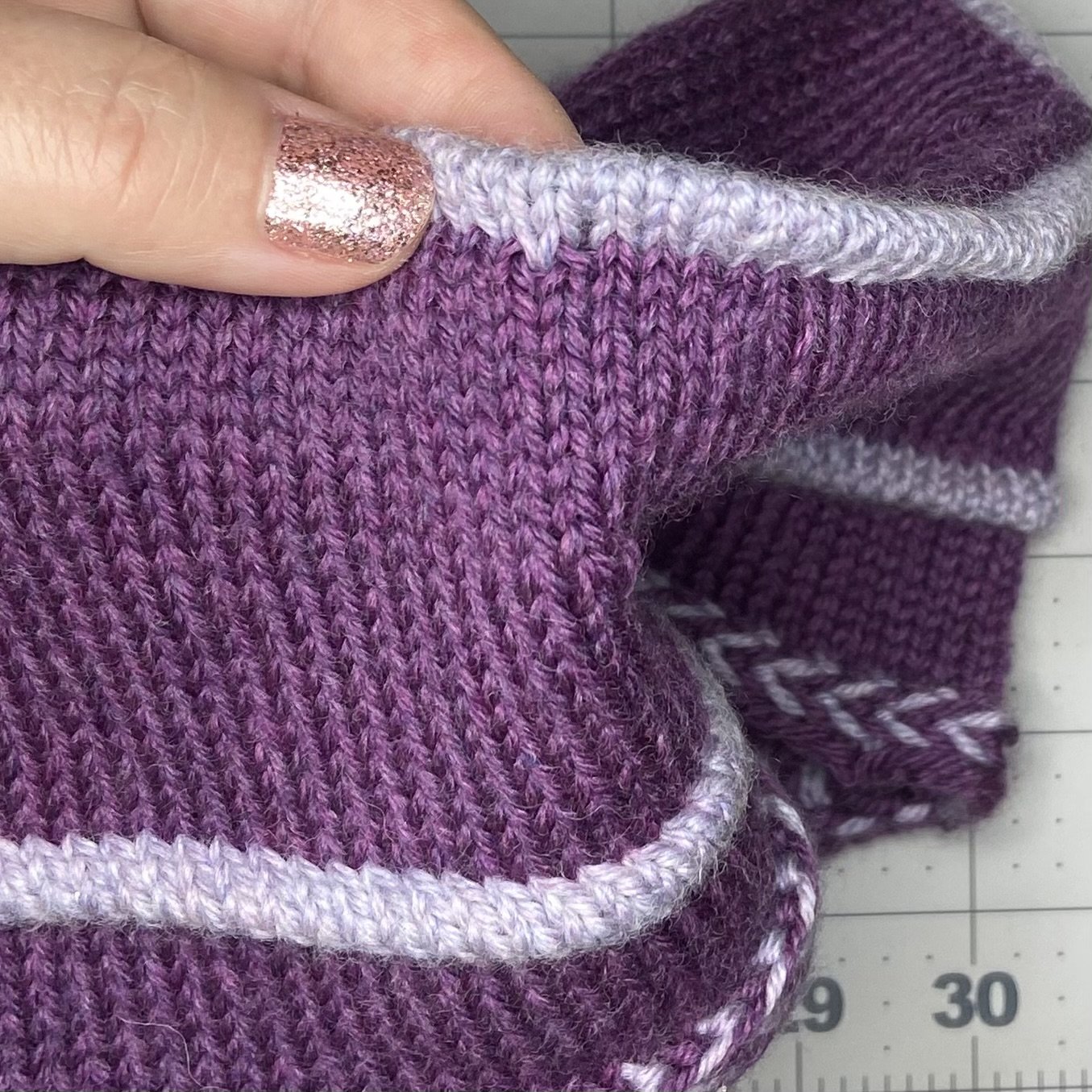 After that, it was mostly single-color stockinette stitch knitting. When I got to the first tuck, I was apparently a little sloppy during my execution. A tuck is just six rounds of the contrasting color, then back to the main color, reach down past the contrasting color rows to pick up the purl bump of the last main color row you did, and knit together with your current stitch. This folds the contrasting color over, leaving your tuck on the outside of your work.
