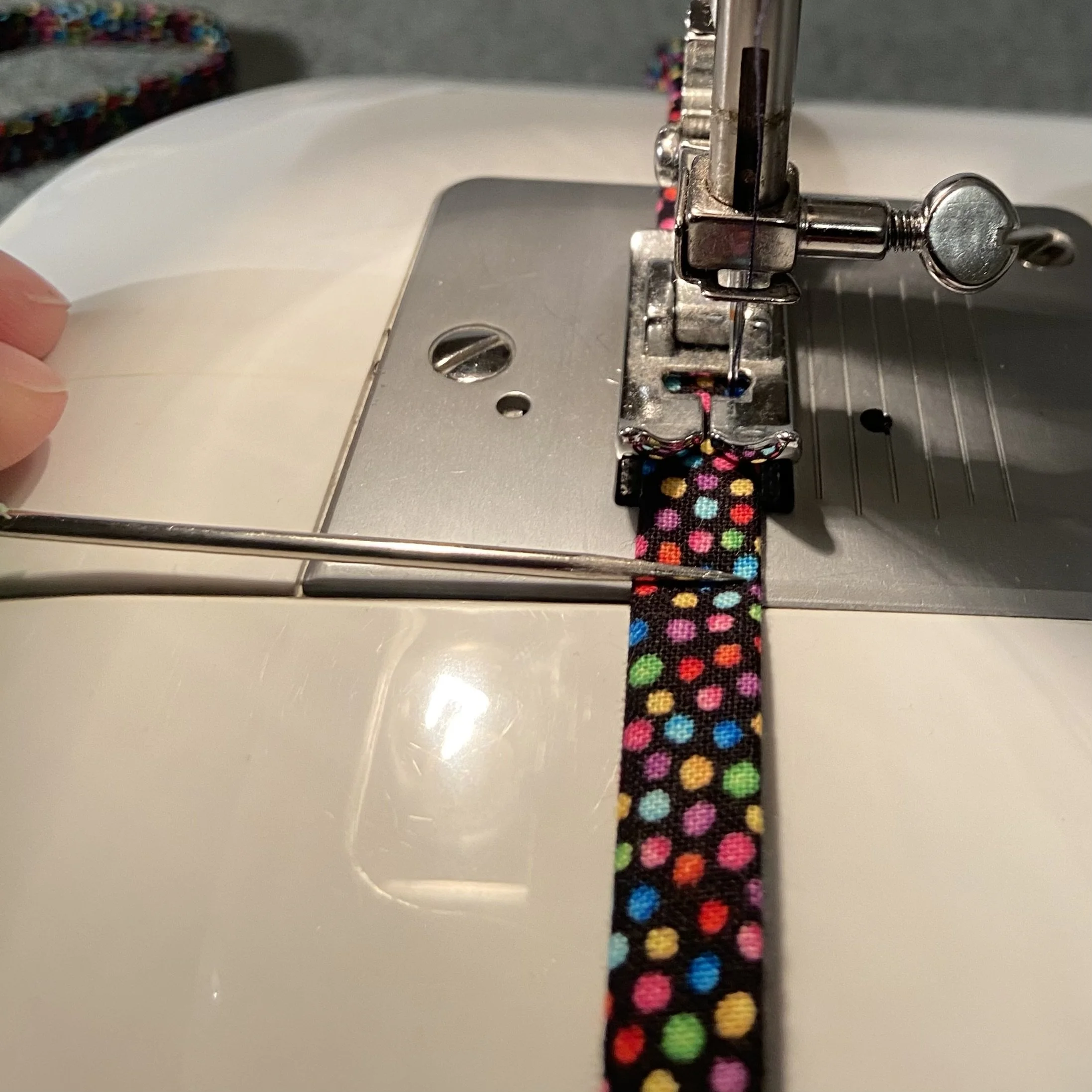 However you decide to do it, once you’ve got your 1.5” strip folded properly into a 3/8” strip, you then have to stitch it down to secure it. Before you start sewing, best to trim off both the selvage edge of both ends and the uneven bit where you cut at an angle to get the fabric into the bias maker. I recommend sewing as close to the edge as you can. After that, you should press again, just to really tightly secure your folds and also to relax the seam you just made.