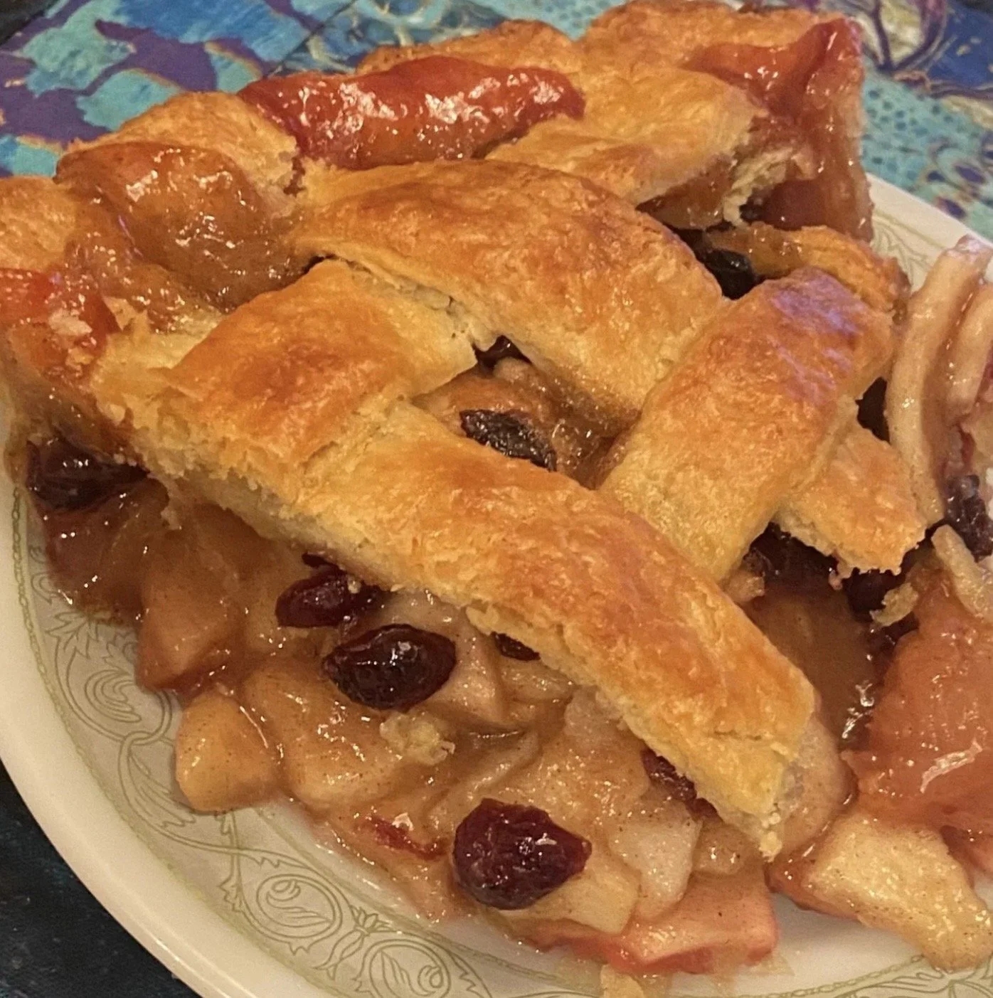 And finally, a glorious CranApple Pie recipe. It took a lot of experimenting before I finally got the flavor balance right, but I have it now, and it’s a fabulous pie! You cook up a sort of syrup for the apples, and set it aside. Then smear a layer of cranberry sauce over the pie crust in its baking dish, mix your sliced apples with the syrup and some craisins (sweetened, dried cranberries), pile that into the crust, and put a lattice crust over the top. As the pie bakes, the juice released by the apples is absorbed by the craisins, making them plump and soft and delicious. I think this year for our family celebration, we will probably have both pumpkin and cranapple pie. Blog post and recipe here.