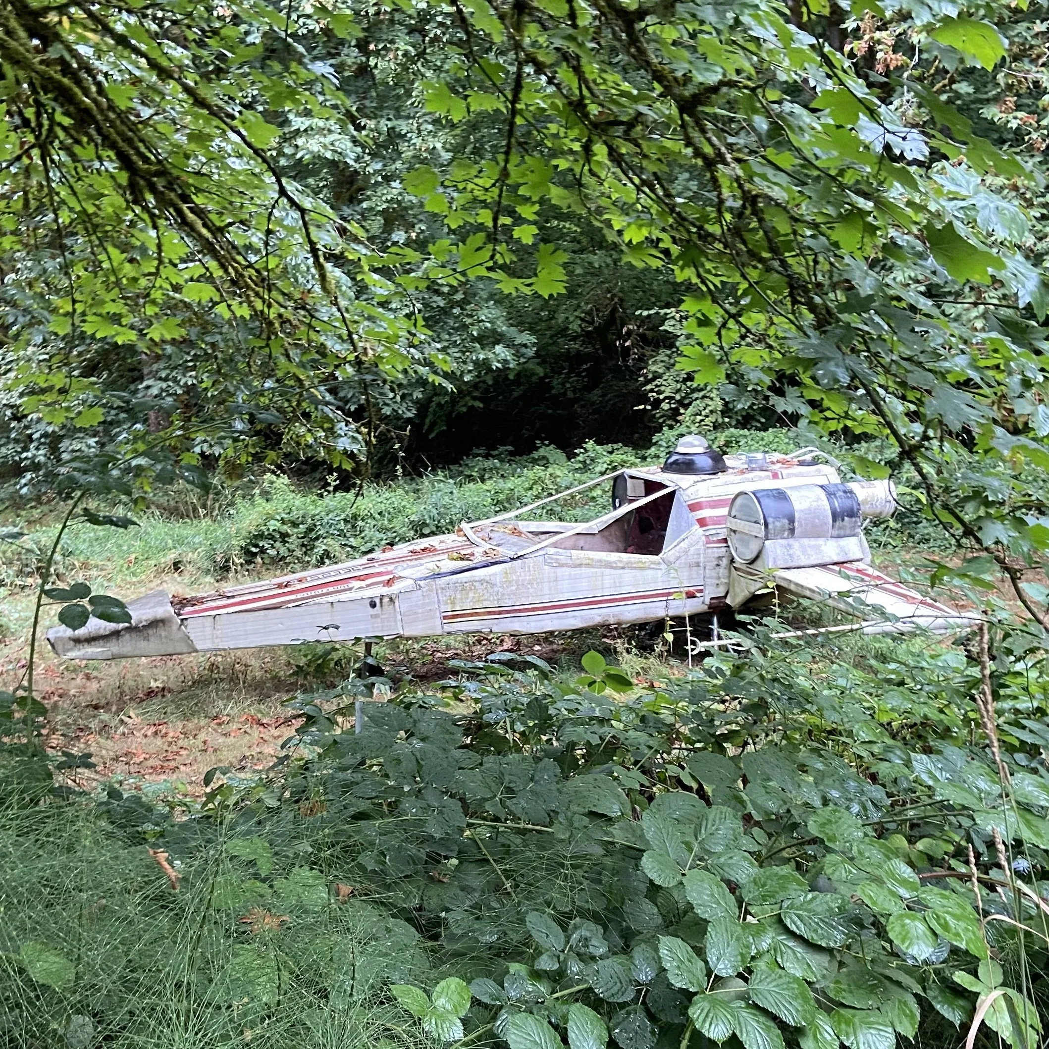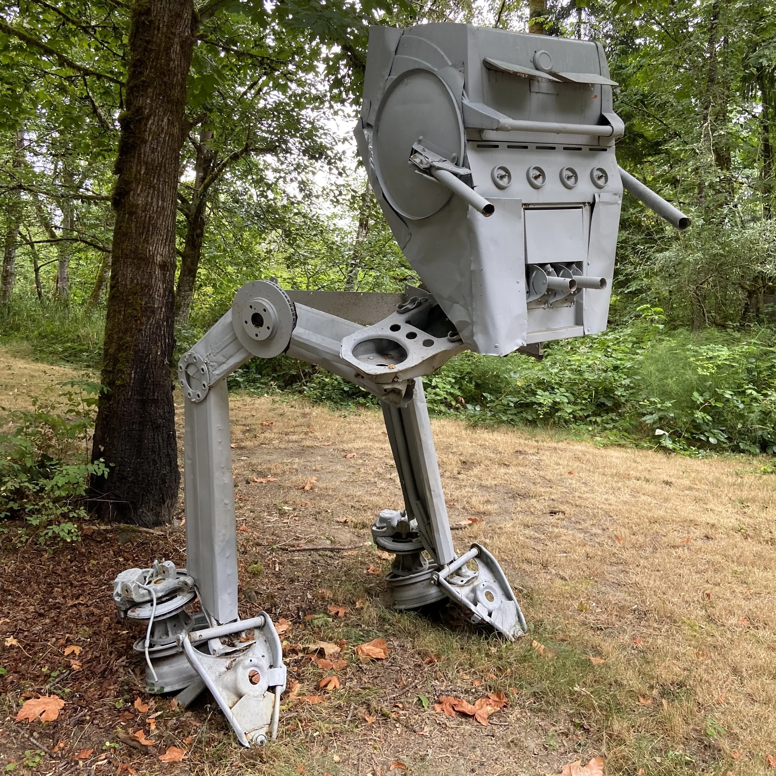 Now, I want to show you a picture which reminds me of Starbuck finding her crashed Viper in the Season 4 episode “Sometimes A Great Notion.” And then I wish to point out that my neighbors, who built this brilliant thing, insist that it’s in fact an X-Wing fighter (which makes sense, given the little dome on the top where R2-D2 would sit). My neighbors also built this AT-ST Walker, which I suppose supports their opinion that they’re building in the Star Wars universe, not the Battlestar Galactica universe.