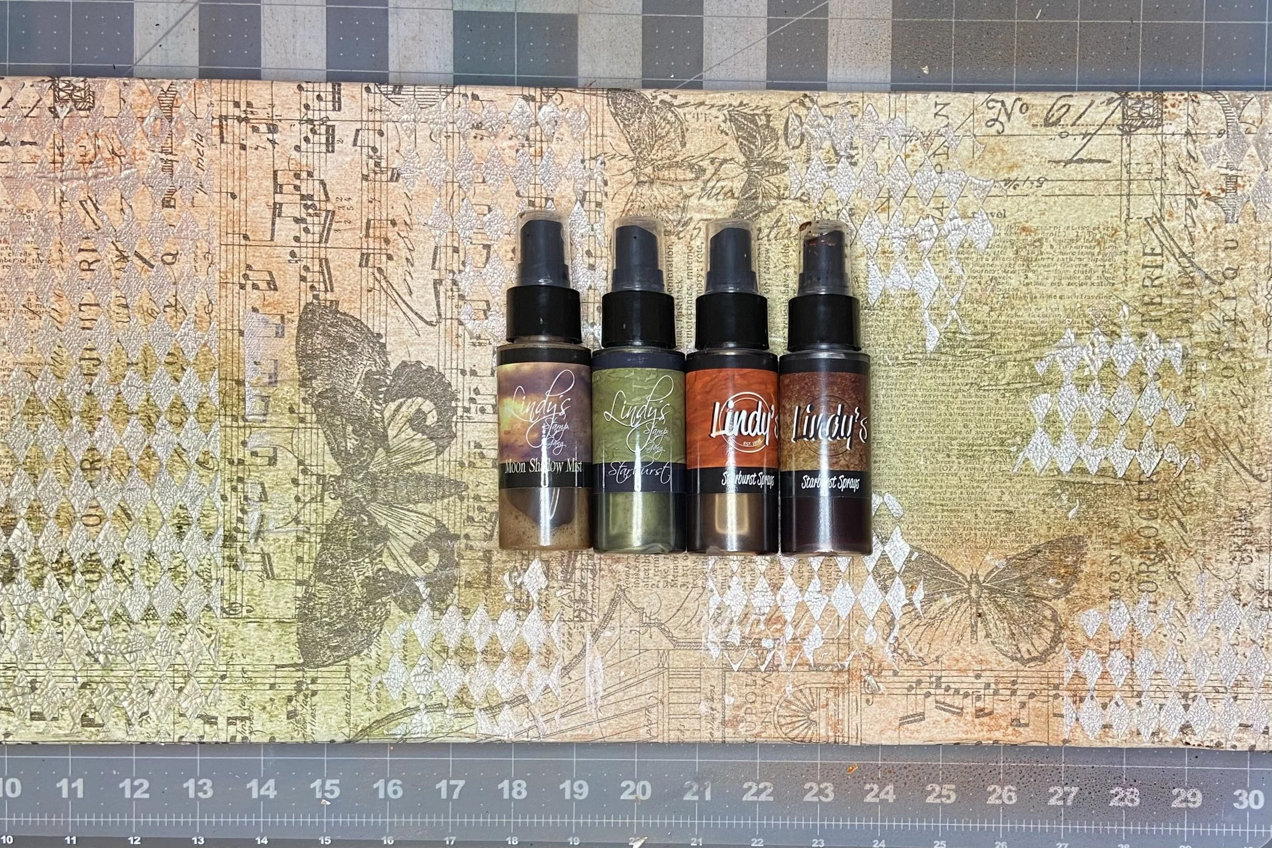 Once the crackle paste was dry (and cracking!), I used four of my Lindy’s Gang sprays, spraying a section and then dabbing away most of the liquid with a paper towel, then switching to another color and another part of the canvas and doing it again. The colors I used were: Red Hot Poker Orange; Green With Envy Green; Cattail Copper Brown; and Buccaneer Bronze.