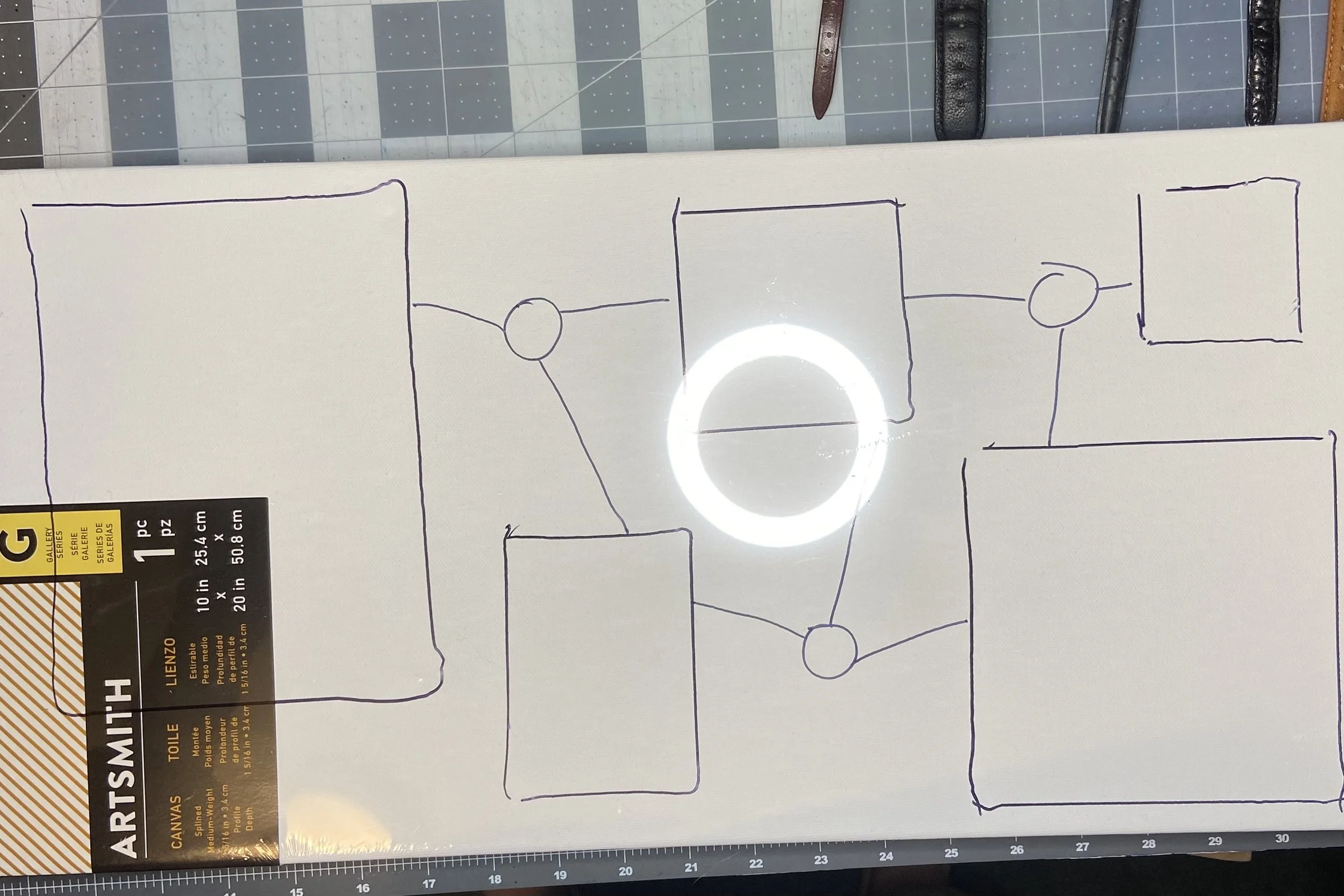 To that end, I did end up buying a 10x20” canvas, as I didn’t have anything that large in the stash. I believe the five smaller canvases came from my stash. Before I unwrapped any of the canvases, I laid the smaller out on the larger and traced around them with a sharpie, then took a picture, so that I could later recall the layout. At this point, I had still been thinking of Sydney for one of my time zones, but that canvas eventually ended up being Madagascar instead. I did a little more doodling with the Sharpie to decide where to place the seals I was going to make.