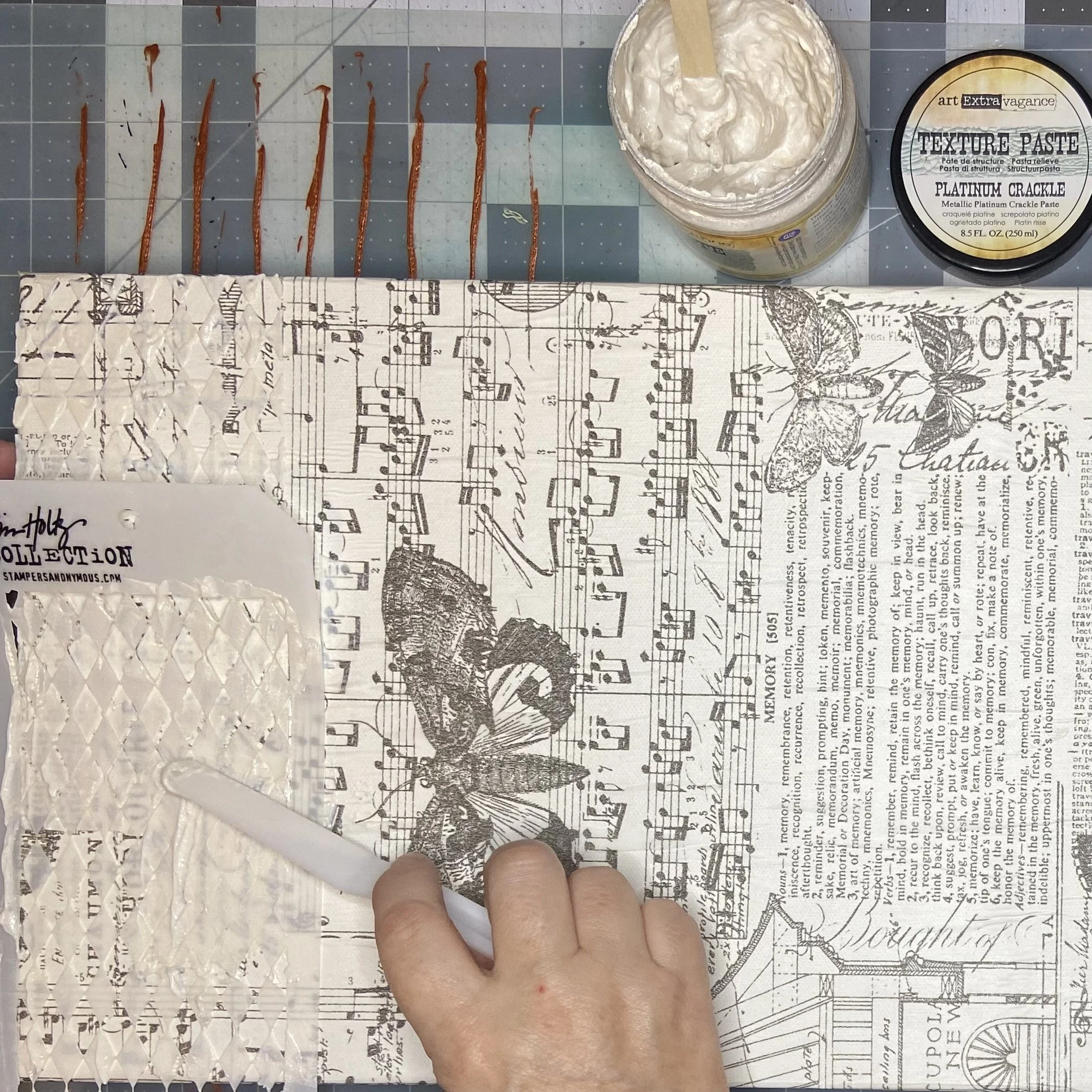 After the gesso dried, I pushed some crackle paste through a stencil in random spots over the tissue paper and let it dry.