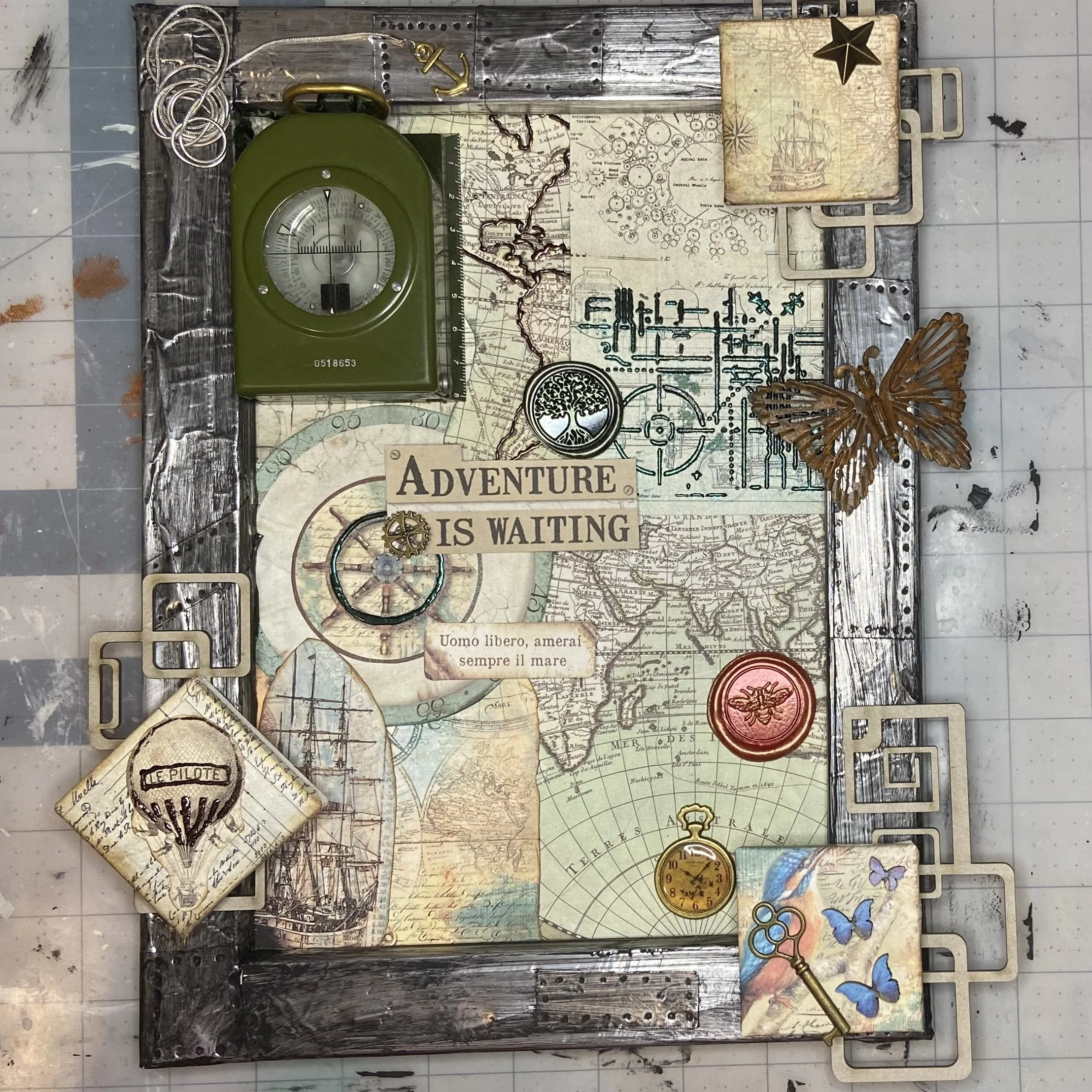 I decided to use items that I already had (except for the compass, of course) and started with canvases. I have a stash of 9”x12” white canvases and also three 2”x2” canvases left over from my All The Time In The World art project. I also took pieces from two paper packs that I’ve had for a little while: Ciao Bella Voyages Extraordinaires and Stamperia Voyages Fantastiques, both of which are chock full of really beautiful designs.