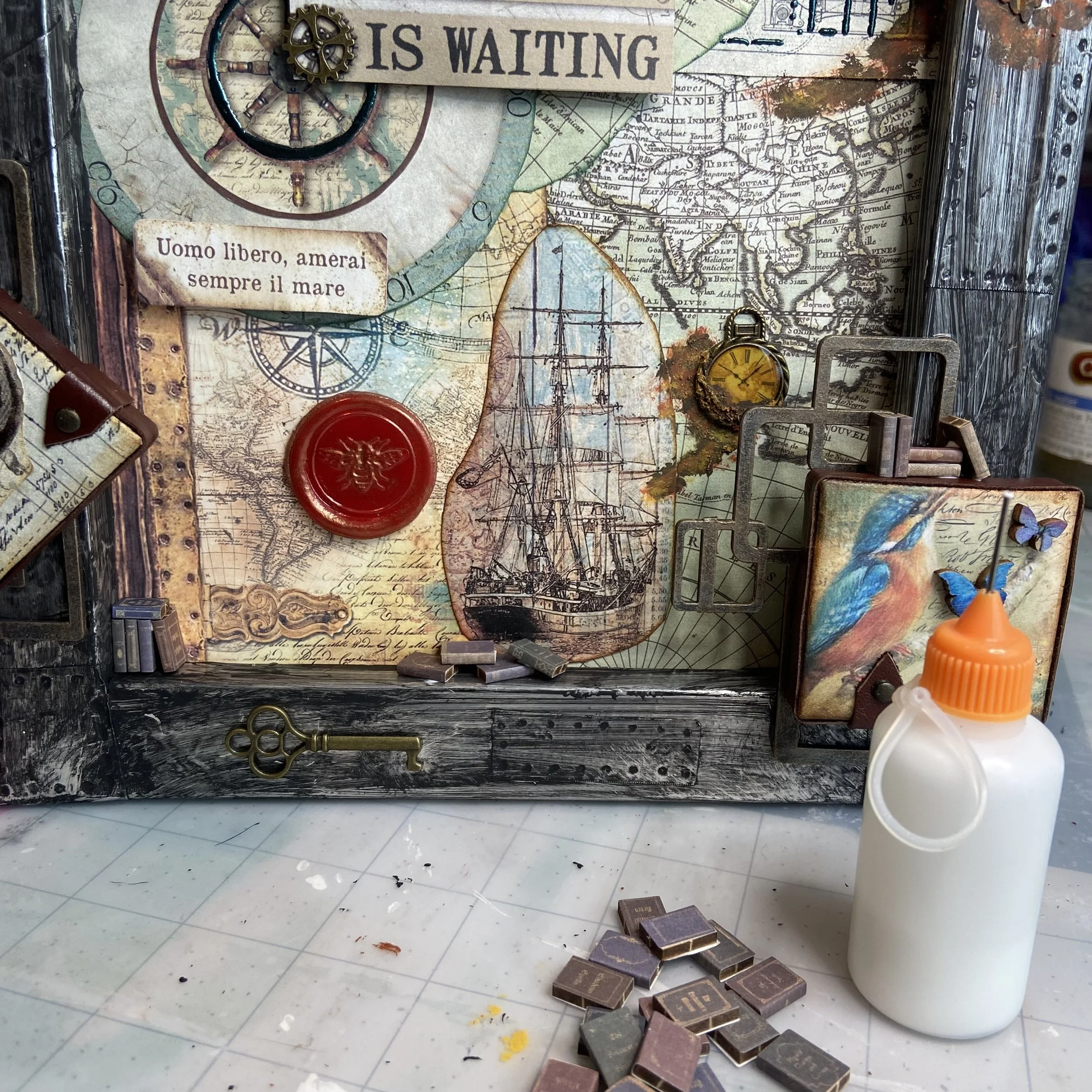 As I was looking at the mostly-finished project, I decided it needed a final embellishment. I pulled out my stash of mini-books left over from my various book nook projects and glued them on in several places. I foolishly used my bookmaker’s glue, even in the places where the books were glued directly to the foil. They seem secure enough, but I really should have used my heavy body gel. Time will tell…