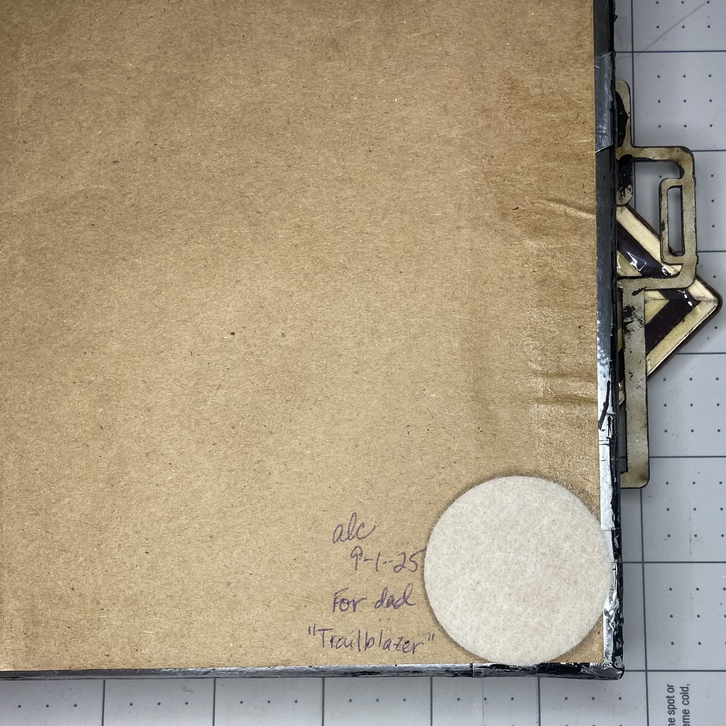 And finally, the hooks and pads. I realized early on in the project that the weight of the piece was not evenly distributed, mostly because of the placement of the compass. So I hooked my finger under the top lip and lifted to see where the center point would be, and then attached the hanger on the back in that spot. I also applied thick felt pads to the bottom corners to help the piece hang straight and not scrape up a wall.