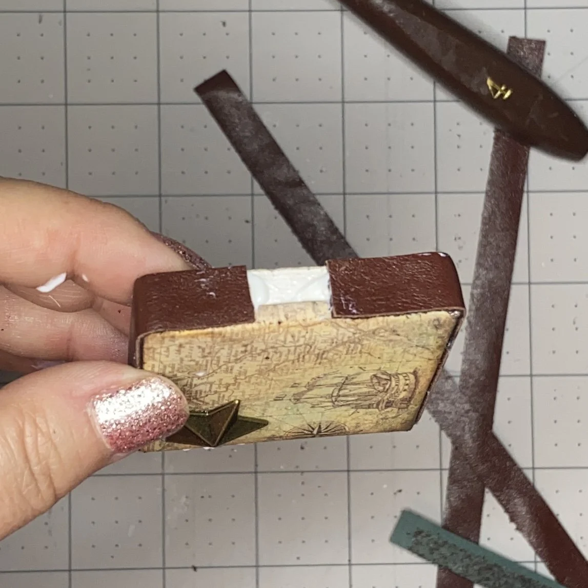 I cut three more strips with my cardstock pattern (adding 1.5” this time!), applied some heavy body gel to the edges of the canvas, wrapped the leather around, cut off any excess, and popped a rubber band on there to hold it in place while the gel dried.