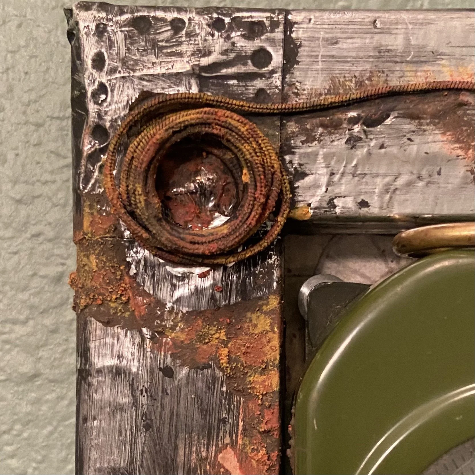 After I was done carefully driving the nails into the hanger, I turned the project right side up only to realize that my coil of “rope” in the upper left corner had come loose. I glued it back down with heavy body gel, but realized only after it had dried that I’d not glued it back into the original spot. This meant that there was now a crescent of bright silver foil showing underneath the rope coil. I took the time to reapply the rust paste trio over that spot.