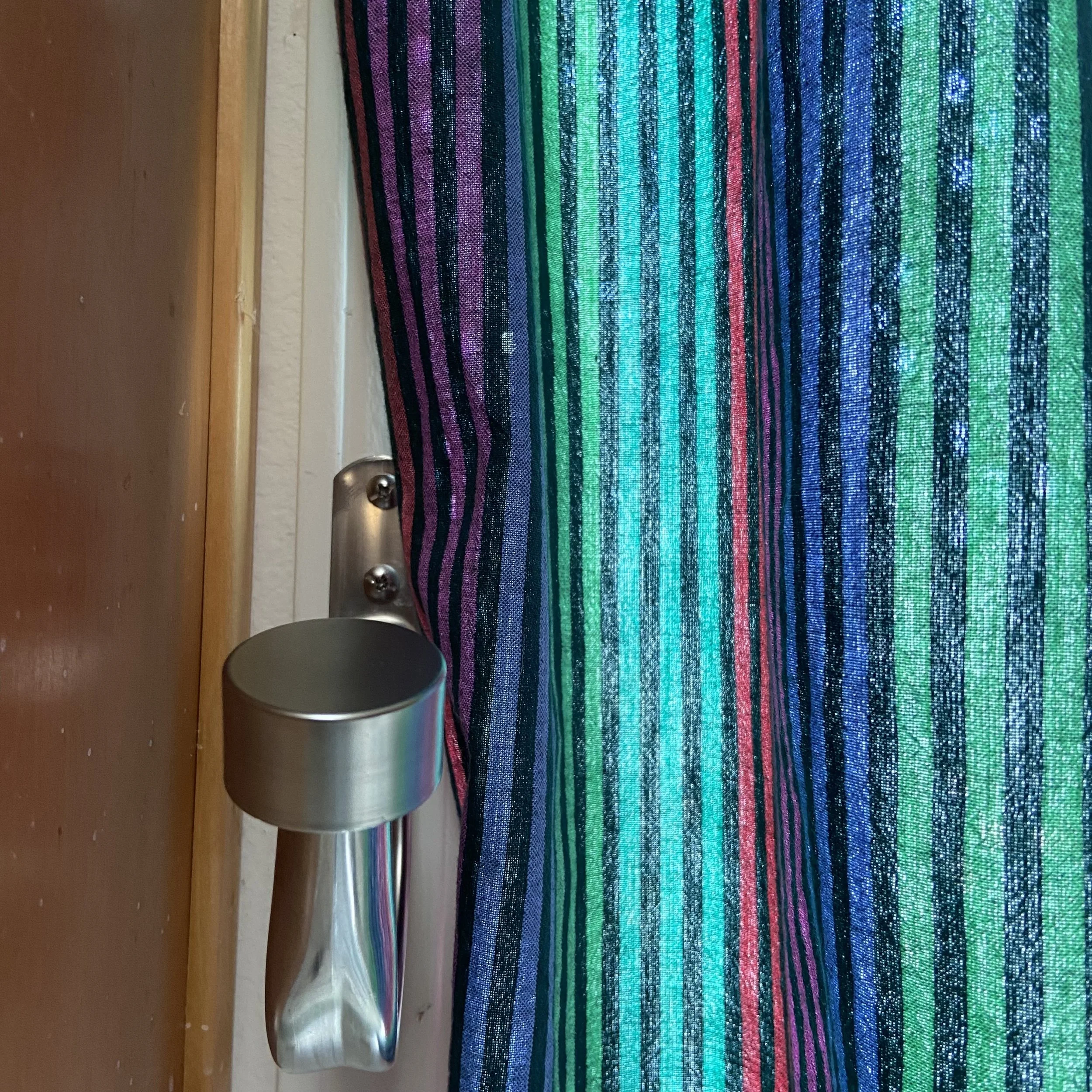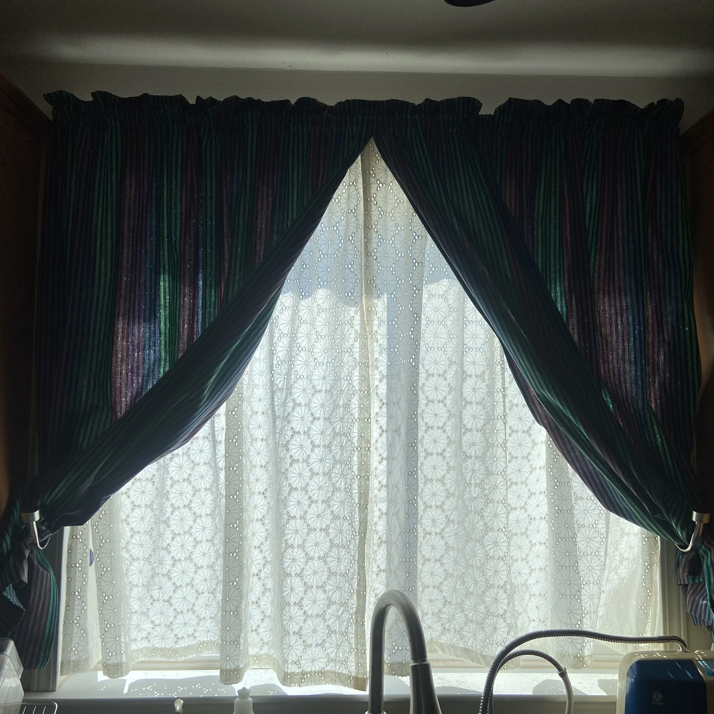 Over the years, I’ve made a pretty double-layered set of curtains for my bedroom, hung some Ikea curtains in some other rooms, and made some rather unique shades for a couple kitchen windows. I’ll have to explain the shade process on some other blog post. But I still had one set of blinds in the window right over the kitchen sink. I decided it was time to make a set of curtains for that window. I wanted a colorful layer that would face into the room, and a light-colored layer between the colored layer and the glass.