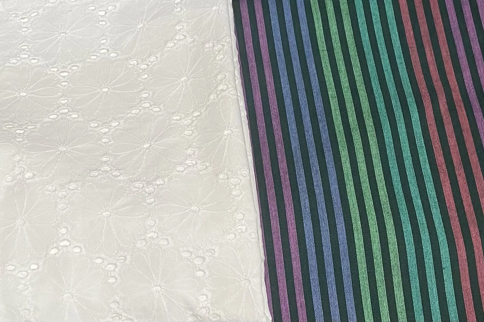 I did some online shopping at my favorite fabric store (Bolt Neighborhood Fabric Boutique) and found an absolutely gorgeous, richly-colored striped fabric where the color was woven in, rather than being printed on one side or dyed in later. And for the lighter layer, I went with a lovely white cotton eyelet fabric.