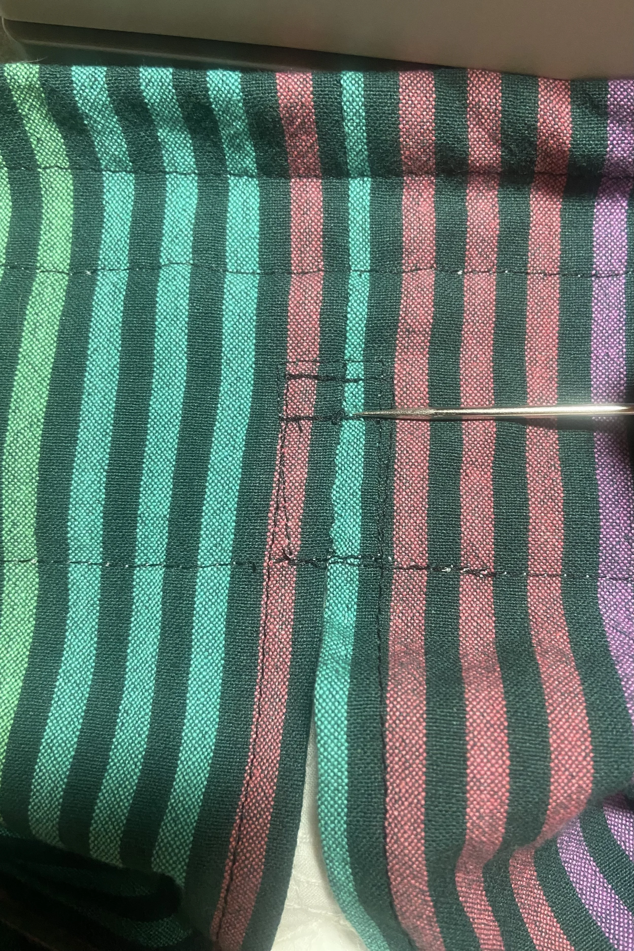 I threaded the original curtain rod through the casing and hung the curtains, so that I could mark the proper length for the bottom hem. Then I hauled everything off the window and back into the studio to finish. Turning up the outer hem was easy. I’d marked where I needed the bottom to be, then folded up at that point. It’s super easy to get a straight line on stripes like this, because you can just line up your stripes and everything is straight. I pressed my turned up fabric, then used my quilting ruler and a heat erasable pen to mark two inches down from my fold. Then I cut off the excess fabric along my marked line, and did a double-fold hem on that remaining two inches. Once the outer fabric was hemmed, I matched the inner eyelet fabric length and did the same thing.